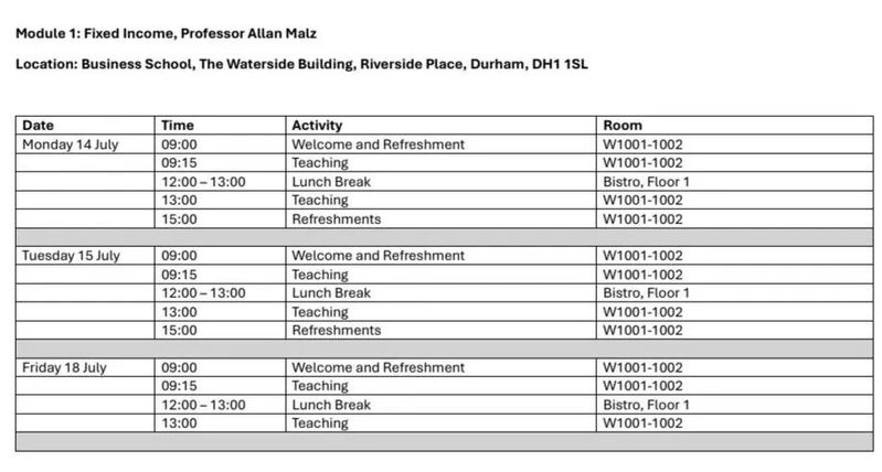 7月14号开始了我们的固定收益市场课程,由哥伦比亚大学的Allan Malz 教授为我们授课,Allan Malz 教授现任哥伦比亚大学商学院讲席教授、副院长,哈佛大学法学院公司治理中心资深研究员,全美金融协会董事会成员,美国国家经济研究局法律和经济学部研究员,金融学国际顶尖期刊 《The Review of Financial Studies》主编。