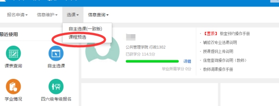 第二步:在菜单“选课”下选择“课程预选”,进入课程预选,具体界面见图1、图2:
