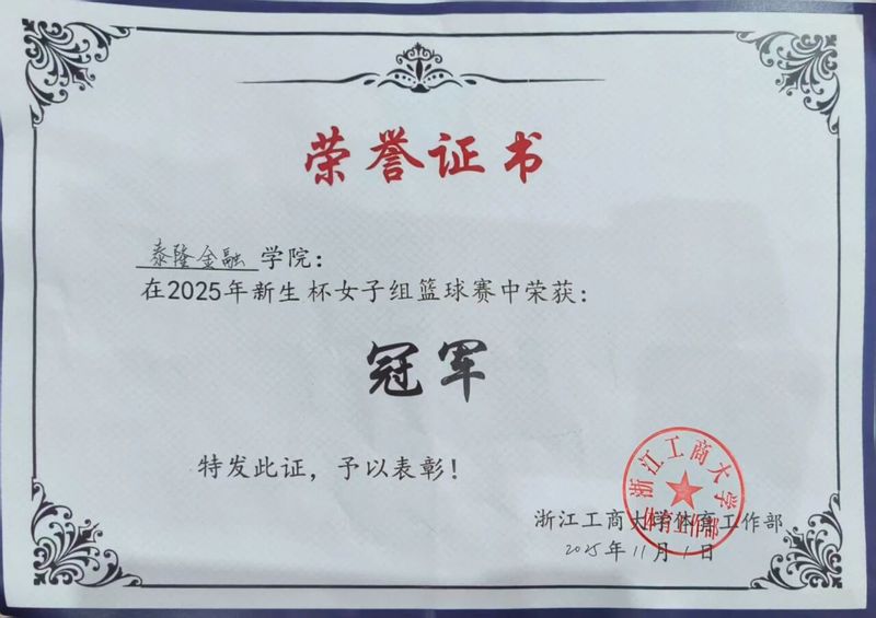 泰隆金融学院女篮以一场精彩逆转夺得“新生杯”冠军!决赛中她们率先取得优势,虽遭对手反超,但在全场“泰隆——防守!”的助威声中,姑娘们沉着应对,防守如铜墙铁壁,进攻稳扎稳打,最终以23:20锁定胜局。终场哨响,队员与观众相拥欢庆,整个赛场成为一片欢腾的金色海洋。这座奖杯,闪耀着胜利的荣光,更凝聚着全院的信念——她们,是泰隆的骄傲!
