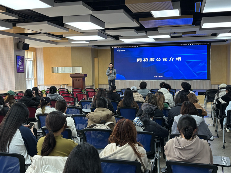 参观结束后,同学们移步会议室,一场精彩的交流分享正式拉开帷幕。首先,由陈经理致辞,表达了对同学们到来的热烈欢迎。其次,同花顺政企事业部产品经理、技术负责人员李肖老师为同学们带来了“同花顺公司介绍”的开场讲座。从公司介绍、业务情况、财务情况以及未来展望四部分展开,向大家揭开了同花顺公司的神秘面纱。